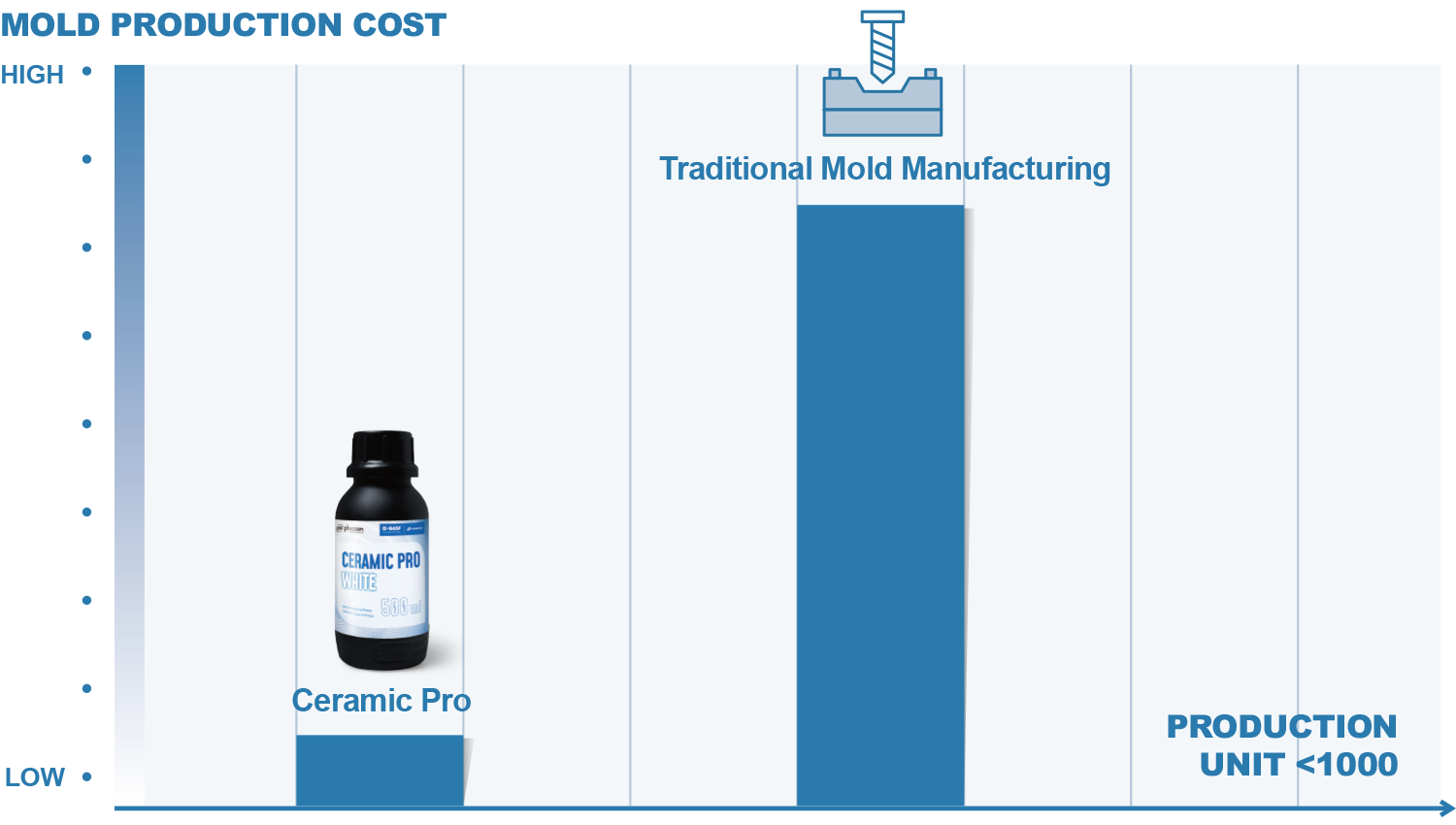 By eliminating high MOQ requirements, long lead times, and extensive tooling costs typically associated with manufacturing, Ceramic Pro Resin reduces mold production time from weeks to under a day while saving up to 80% of production costs.